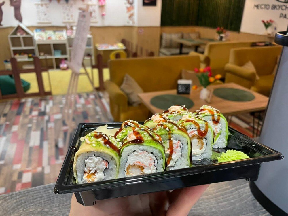 Хрустящая креветка,огурец, нежный краб, авокадо, соус сырный , соус унаги, соус песто.