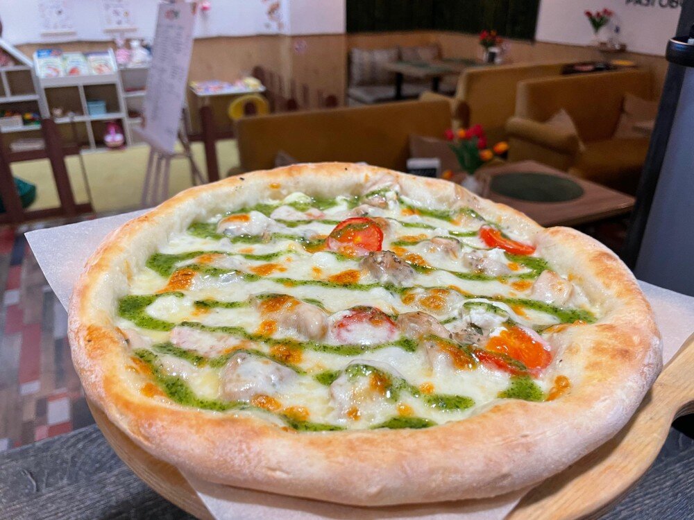 Сливочный Соус, Моцарелла, Филе Куриное, Брынза, Черри, Песто.