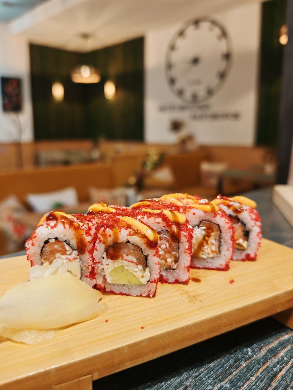 Лосось, огурец, краб, икра красная, спайси соус, унаги соус, кунжут.